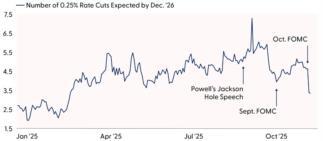 As widely expected, the Federal Reserve (Fed) cut interest rates by 0.25% at its October Federal Open Market Committee (FOMC) meeting last week. Similar to last month, the accompanying policy statement noted that economic activity has been expanding at a moderate pace, and the unemployment rate has remained low, despite rising downside risks to the labor market. With limited economic data available due to the ongoing government shutdown (outside of private sector data), there were few surprises in the press release. Recently appointed Fed Governor Stephen Miran dissented again, favoring a 0.50% interest rate cut, while Fed Governor Jeffrey Schmid preferred no change to the target range this month — a new dissenter since the September FOMC meeting (he voted in favor of a 0.25% cut last month). With its conflicting dissents, the Fed decision is reminiscent of September 2019, when the Committee cut rates, but some wanted a more aggressive cut, while others preferred no change at all. Remember that at that time, the economy was adjusting to the selective tariffs implemented during Trump 1.0. And incidentally, the committee implemented two more cuts later in 2019.