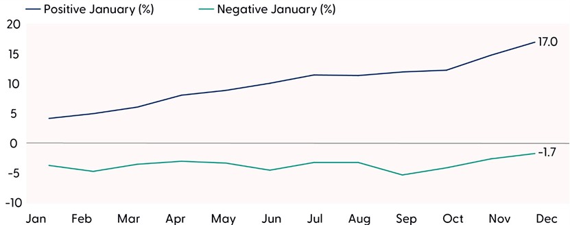 Recent developments in technology (DeepSeek) and headline tariff risk have rattled markets, but, despite near-term risks, we believe investors should give the bull market the benefit of the doubt. After all, since 1950, the average bull market tends to last over five years, and this bull just turned two last October. Plus, it’s hard to dispute the bullish momentum in the broader market. The S&P 500’s impressive 23.3% gain in 2024 carried over into January. Despite a slow start, the index rebounded to achieve a 2.7% gain last month, and historically, a positive January has been a bullish indicator for stocks. Yale Hirsch, the creator of the “Stock Trader’s Almanac,” identified this pattern in 1972, calling it the January Barometer with the famous tagline, “As goes January, so goes the year.” Hirsch’s adage has stood the test of time, making the January Barometer one of the most popular and respected seasonal indicators. Since 1950, the S&P 500 has averaged an annual return of 17% in years with a positive January, with 89% of those years also ending positively. Additionally, the index has averaged February–December returns of 12.2%, with 86% of those periods ending in positive territory. Conversely, when the S&P 500 declined in January, annual returns averaged -1.7%, with only 50% of those years ending positively.