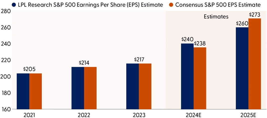 LPL Research’s forecast for S&P 500 earnings per share (EPS) in 2025 is $260, in line with the long-term average earnings growth rate near 10%, but below current consensus estimates near 15%.