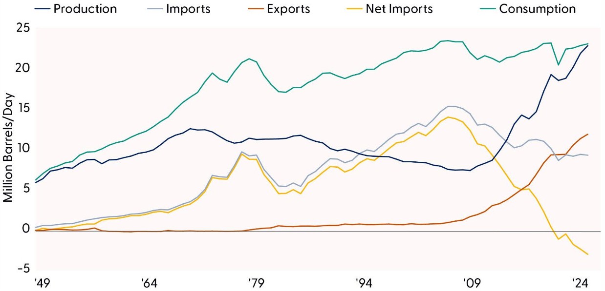 The latest data from the U.S. Energy Information Administration (EIA) shows that the U.S. has firmly established itself as a net exporter of total petroleum products, a shift that first occurred in 2020 and has continued for several years. In 2024 (the latest data from the EIA), U.S. petroleum exports averaged just under 11 million barrels per day, exceeding imports of about 8.4 million barrels per day, marking the fifth consecutive year in which the U.S. held net exporter status. This structural change reflects not only higher domestic production but also the growing role of refined petroleum products and liquids flowing to global markets. As the U.S. continues to expand its export footprint, it becomes less impacted by oil price shocks that have historically weighed on domestic economic performance. For a deeper dive, consult the March Economic Navigator.